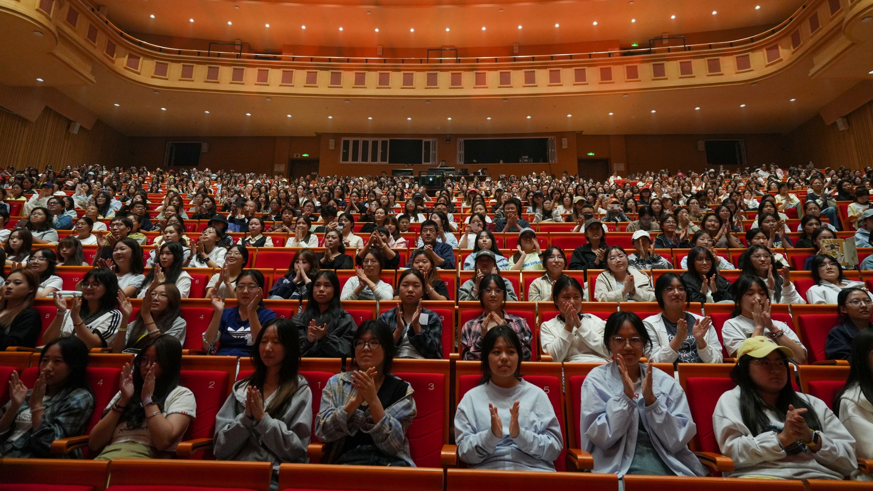 音乐会以“上、中、下” 三大篇章展开,层层递进勾勒盛唐气象。上篇的《朝乐》《春江花月夜》《满庭芳》《上元乐》《清平调》,让新生沉浸在盛唐的典雅意境中;中篇的《长安乐》《破阵乐》《丝路驼铃》《关雎》则让新生感受到传统艺术的多元表达;下篇的《霓裳羽衣曲》《塞下曲》《庆善乐》《万世太平》则以恢弘乐声将演出推向高潮,全场掌声此起彼伏。