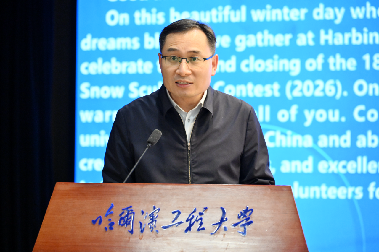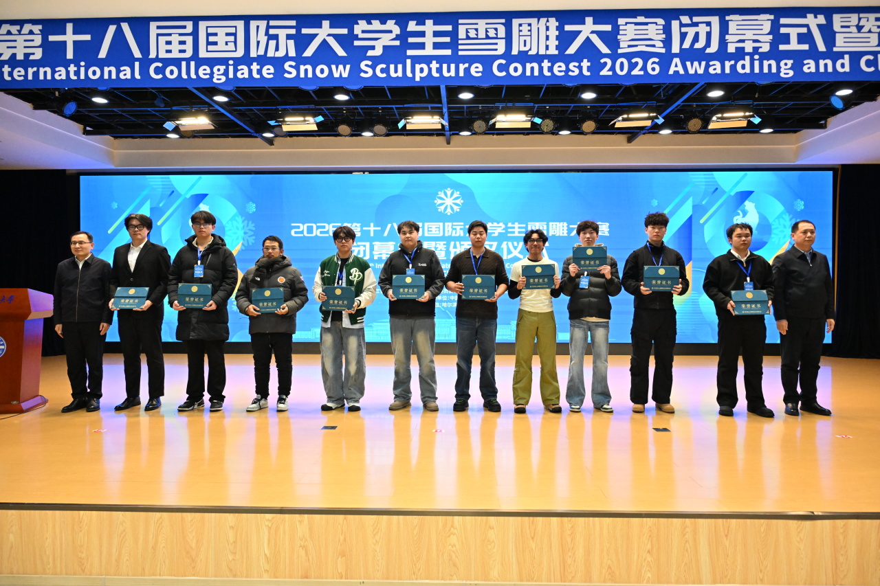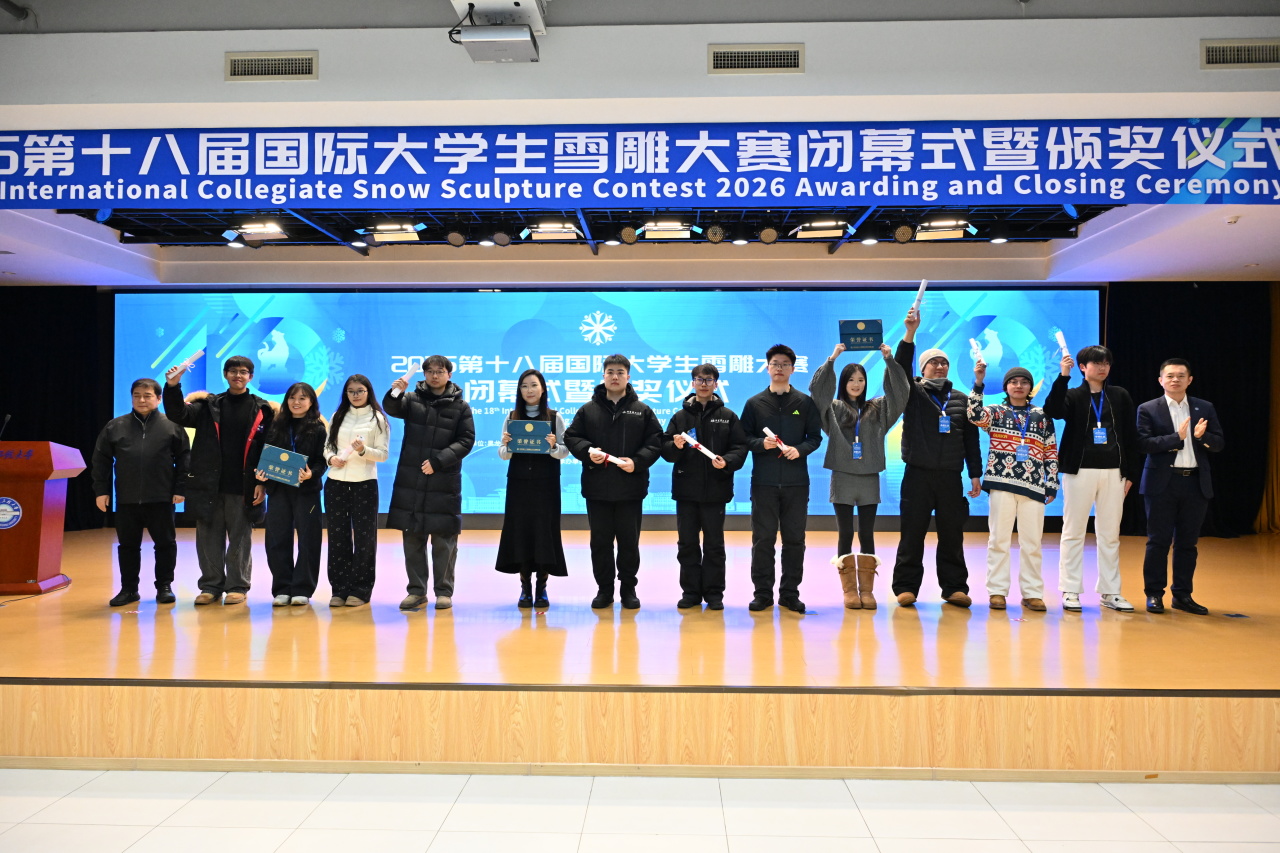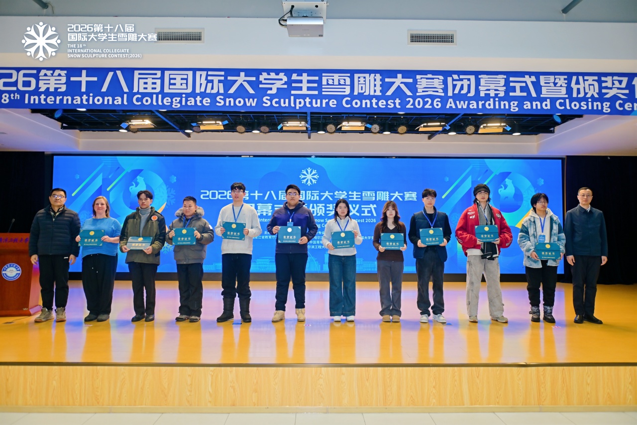 1月7日,2026第十八届国际大学生雪雕大赛闭幕式暨颁奖仪式在哈尔滨工程大学启航活动中心多功能厅举行。