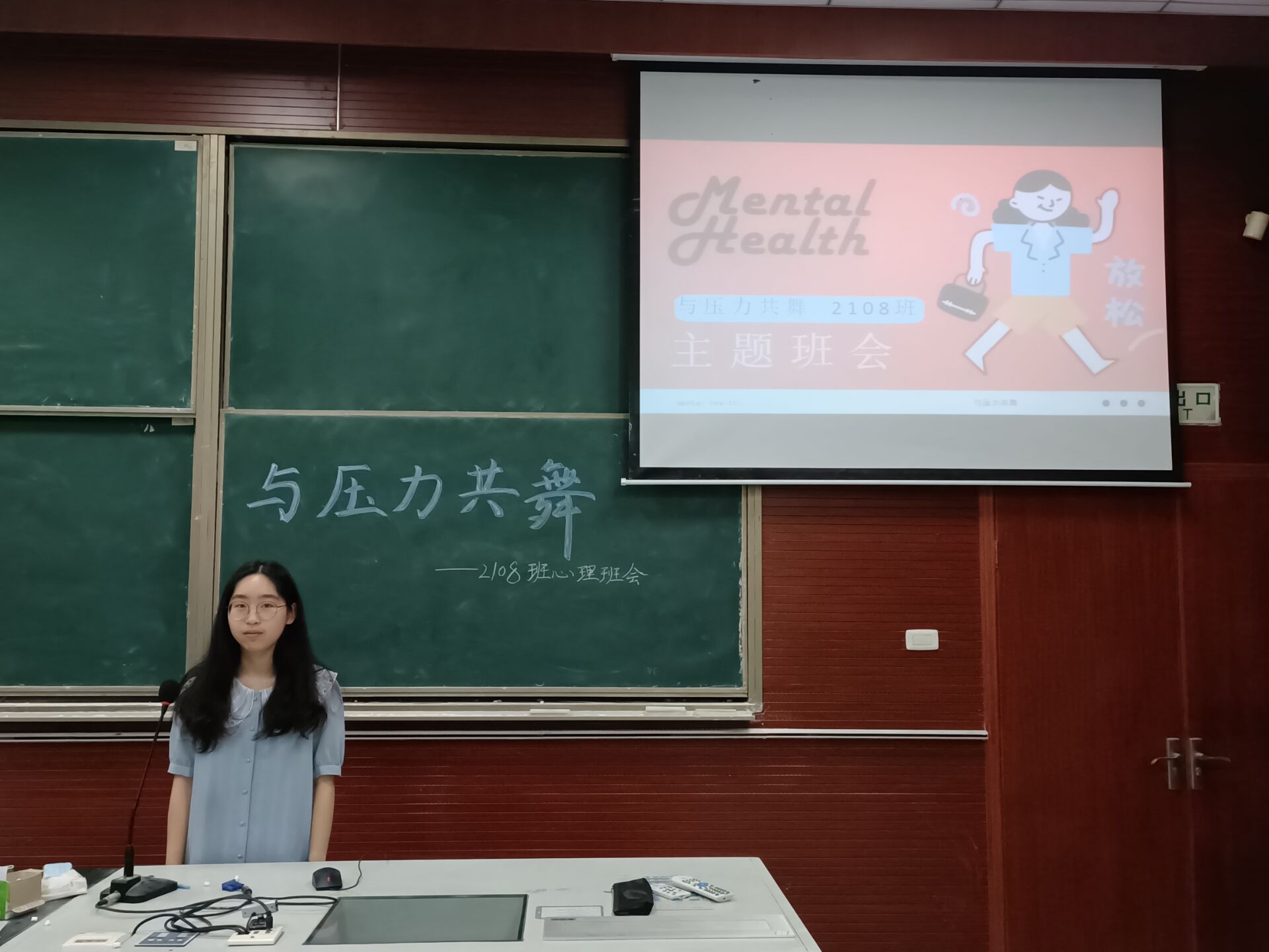 临近期末,同学们的学习、生活等各方面的压力都积累到了一定程度,为了帮助同学们缓解心理压力,更好地调整学习状态,华中师范大学于6月3日下午,由2108班心理委员虞婕组织,开展“与压力共舞”主题班会。2108班全体同学到场参加,班主任陆良秋为指导教师。