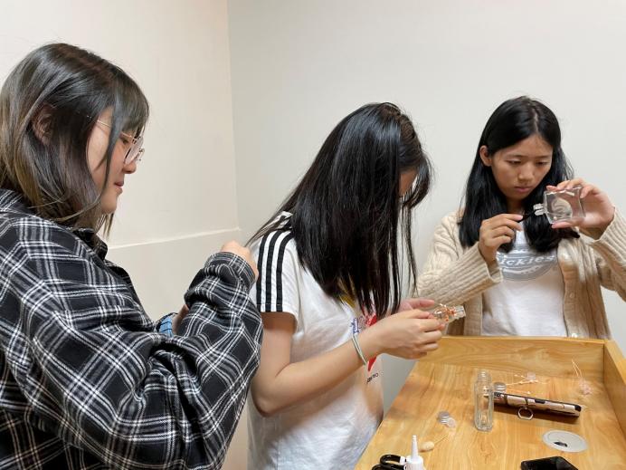 在制作的过程中,同学们开始发挥学习的主观能动性,各自表达对创作的想法,在社长罗逸欢同学的建议和修改后开始着手创作。透明的玻璃瓶,修建琐碎的花枝,由镊子放入,灌上油,便是存着春天的浮游花。