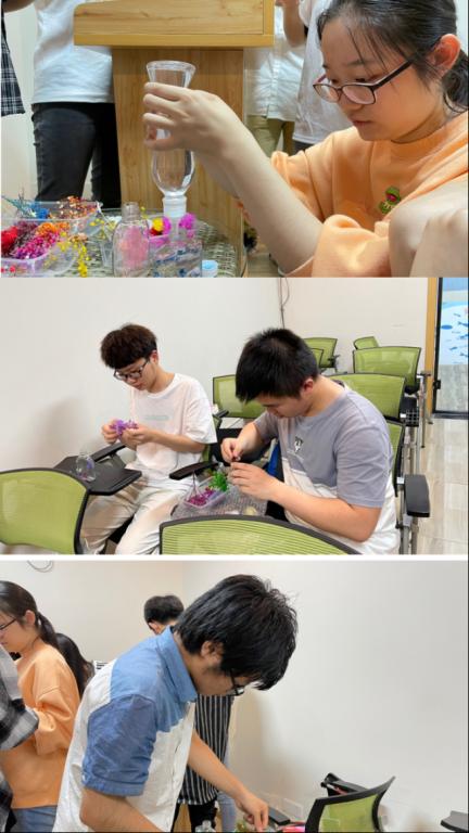 时间已经过半,同学们手中的创作也即将完成。临近封瓶时,大家对周围同学需要改进的作品提出自己的交流建议,对做得好的作品进行询问并学习。制作浮游花对同学们来说虽然是一次新的尝试与突破,但亲手实践才是接触花卉新知识的最好途径。