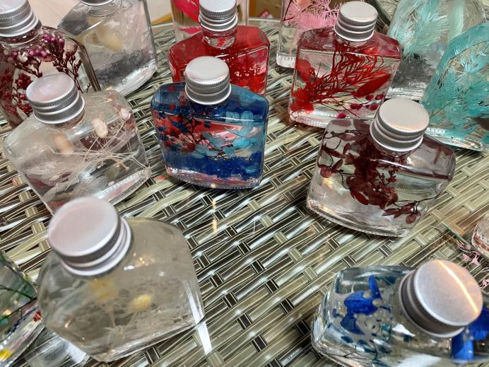 活动临近尾声,同学们的创作的浮游花纷纷封瓶。美丽的浮游花瓶摆放一起,瓶内的花枝显得更加娇艳,犹如鲜花。每一个花瓶都给人带来视觉上的享受,有妖艳欲滴,也有高贵清雅,完美融合瓶中的光影艺术与花卉的自然之美。