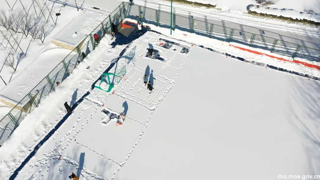 因为过厚的积雪不断灌进鞋内,整个测绘和草稿踩绘的环节进展缓慢。草稿完成之后,同学们开始除雪绘图,铲雪、培雪、封边。在雪地上巨幅的画作相较于在纸面上有很大的难度,从正常视角上只能凭借着同学们的感觉进行绘制,还需要对照着无人机不断调整图案细节。天气寒冷,心情炽热,一天下来,被大雪浸湿的鞋子、裤子已经结冰,口罩也早已冻得变硬,但最终在10余人的共同努力下,两个主题图案历时12个小时初见模样。