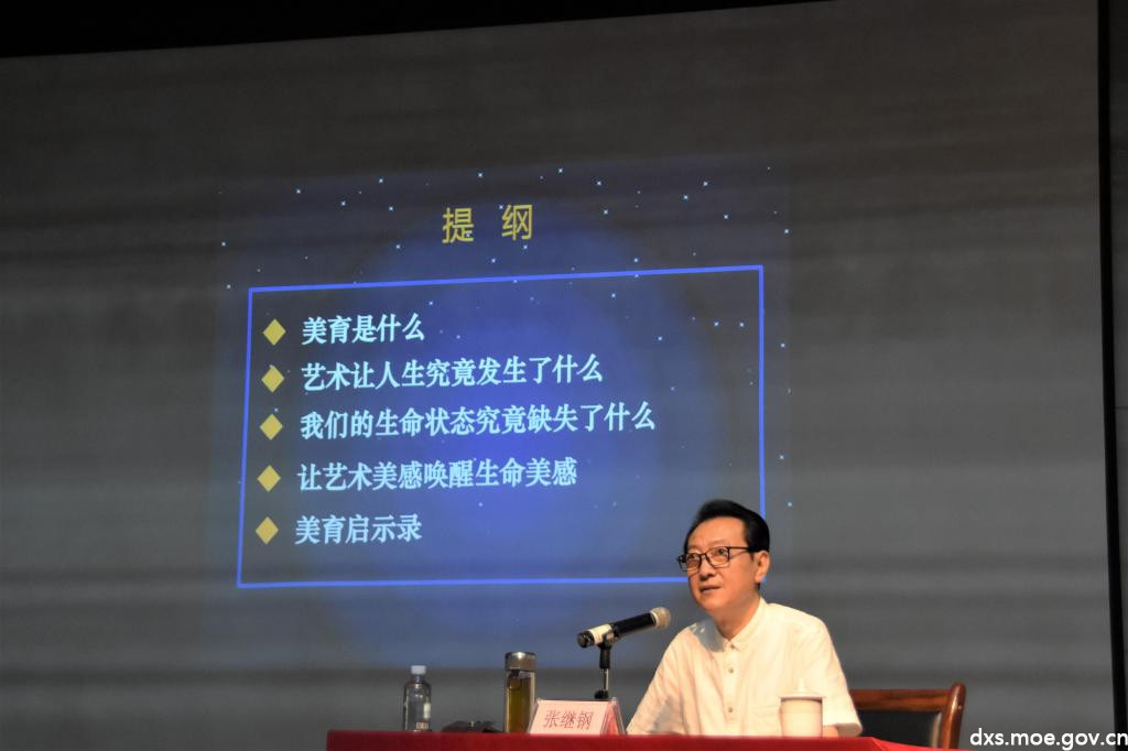 张继钢还结合精美的影片范例和富有哲理的故事,层层递进阐释了美育对人性的教育和启示作用。他表示自己曾亲身走进琼海市嘉积中学的舞蹈团的孩子们身边,正是凭借舞蹈,让他们感悟到了生命的力量与美好。在张继钢为他们编排《万泉河》的那一年,许多孩子都以优异的成绩考入了理想的大学。在回答何为“美育启示录”时,他总结道:“崇尚美是人类最伟大的文明成果,美育是教育的先导,不从美育开始的一切教育都将是支离破碎的。美育的缺失,在艺术层面是缺失了独特和品质,在道德层面是缺失了真实和善良。”