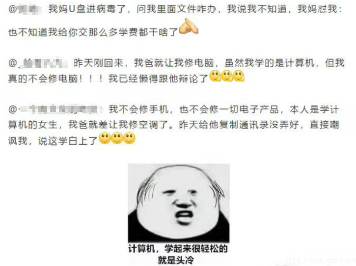 老师当我被问到“你是学什么专业的”时候该怎么回答呢?比如,我是计算机专业的,很多亲戚一听到我是计算机专业的,首先想到修电脑的,顺便就会说:家里的电脑总是出问题,让你帮忙修一下,但是计算机专业的学生并不都会修电脑!
