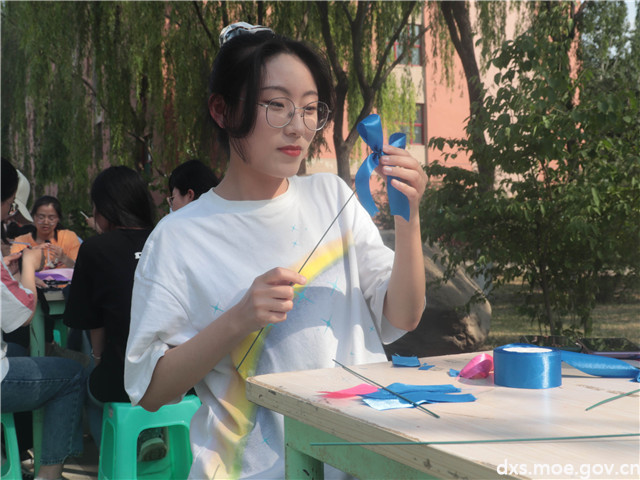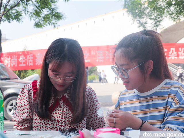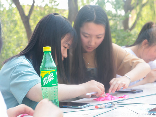 在简单的教学过后,同学们纷纷开始了花朵的制作。每一位同学都摩拳擦掌投入到了紧锣密鼓的制作中。在这一过程中,虽然有遇到一些迷惑和困难,但都被一一解决。制作花朵是一个让人心情愉悦的事情,在花朵的制作中,放松心情,陶冶情操。虽然天气有些炎热,但这依旧抵挡不住大家对花朵的喜爱。