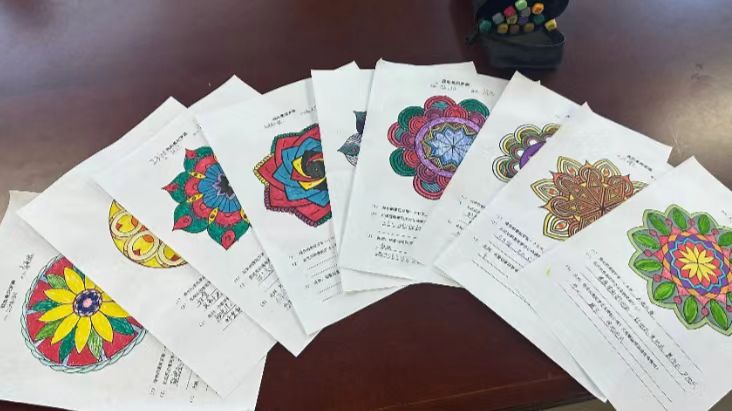 随着精心准备的曼陀罗图案底稿轻轻铺展在桌面,五彩斑斓的彩笔逐一落入同学们的手中,一场关于色彩与梦想的创意之旅正式启航。同学们精心挑选着各式各样不同的画笔,在属于自己的曼陀罗上尽情绘画出五彩斑斓的不同色彩。每个人的选择都独具特色,各不相同,恰恰反映出他们当下丰富多彩的心理状态。在整个过程中,大家都极其专注,仿佛完全沉浸在自己的艺术世界里。现场安静得仿佛能听见画笔在纸上轻柔滑过的细微声响,只偶尔传来极其轻微的呼吸声,如同一个被施了魔法的宁静空间。